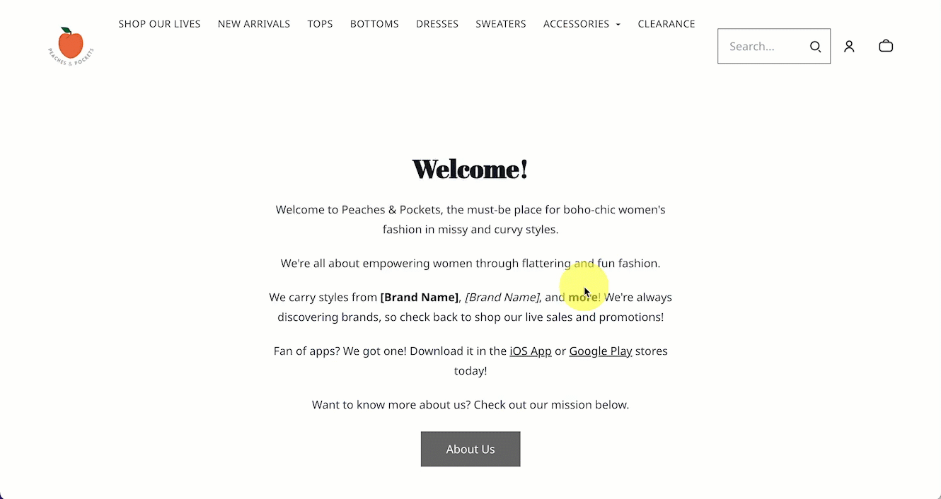 Shoppers who navigate to your webstore URL (e.g., https://myshop.commentsold.com/store) or your custom domain (e.g., https://www.myshop.com) can access their account page by selecting the User icon in the top-right corner of the page.