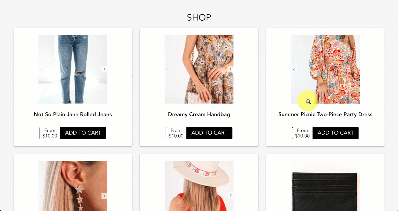 In the Shop section, shoppers can browse active products you have for sale. Shoppers can select Add to Cart to select their preferred variant. If the product is out of stock, the shopper can select Add to Waitlist. If the product is in stock, the shopper can continue with adding the product to their cart.